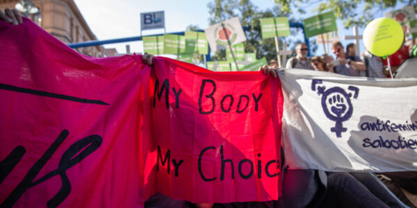 Bericht vom »Marsch für das Leben« 2019 in Berlin – Die Gleichsetzung von einem geborenen Menschen mit einem menschlichen Zweizeller trägt immer neue Blüten: Dieses Jahr versuchten die Abtreibungsgegner*innen an humanistische, linke Bewegungen für die Seenotrettung im Mittelmeer oder auch fridays for future anzuknüpfen. Der Marsch wurde erfolgreich durch linke Gruppen blockiert.