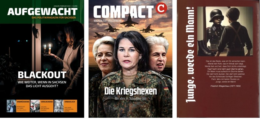 Für die vorliegende Magazine-Ausgabe haben wir uns auf die Analyse dezidierter Dystopien und Krisen fokussiert. Wir wollten wissen, welche (Bürger-)kriegsszenarien derzeit als wahrscheinlich diskutiert, welche Akteur*innen als zentrale Verursacher*innen ausgemacht und welche Handlungsstrategien empfohlen werden. Der Analyse lagen vier Zeitschriften zugrunde, bei denen neben den genuinen Krisennarrativen auch explizite Texte erwartbar waren: Die frisch fusionierte Zeitschrift Aufgewacht – Die Deutsche Stimme der beiden Parteien Die Heimat (ehemals NPD) und Freie Sachsen war allein schon aufgrund ihres Neuzuschnitts von Interesse. Das Compact-Magazin ist für seine drastischen, emotionalisierenden und krisenbetonten Szenarien bekannt. Das Monatsmagazin Zuerst! widmet sich seit jeher auch militärischen Fragestellungen und in der neonazistischen Zeitschrift N.S. Heute vermuteten wir Handlungsanweisungen in Zeiten möglicher kriegerischer Auseinandersetzungen in Deutschland. In die Auswertung einbezogen wurden jeweils die Ausgaben ab 2023.