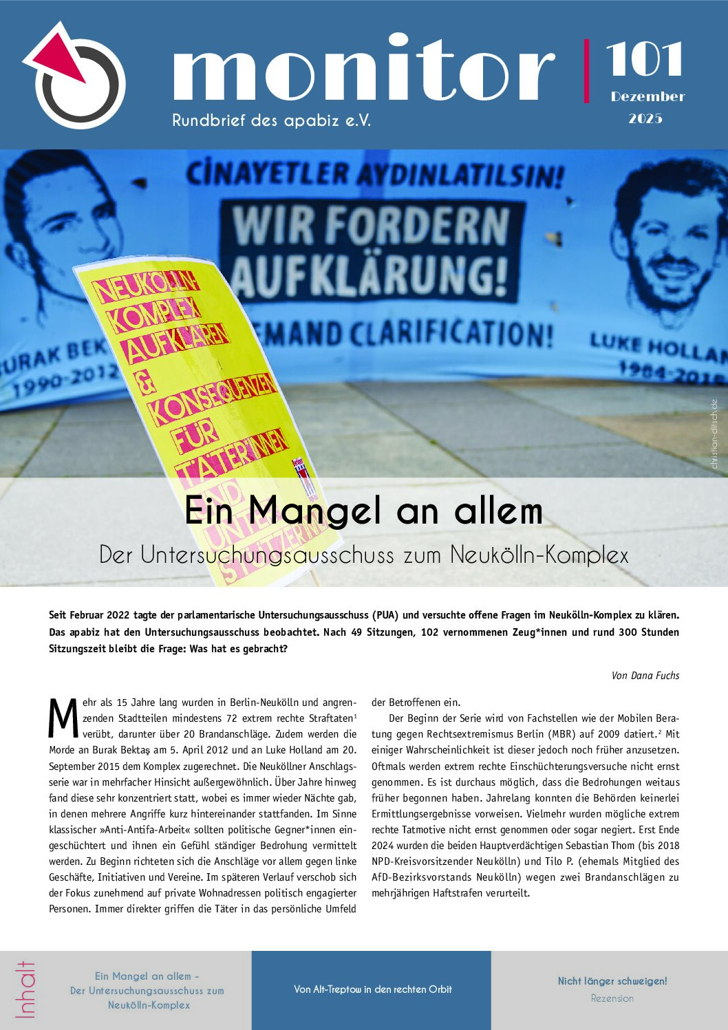 Der apabiz-Rundbrief »monitor« erscheint seit 2001. Hier berichten apabiz-Mitarbeiter*innen über aktuelle Entwicklungen in der extremen Rechten, über Themen, an denen wir arbeiten und über Neues aus dem Archiv.